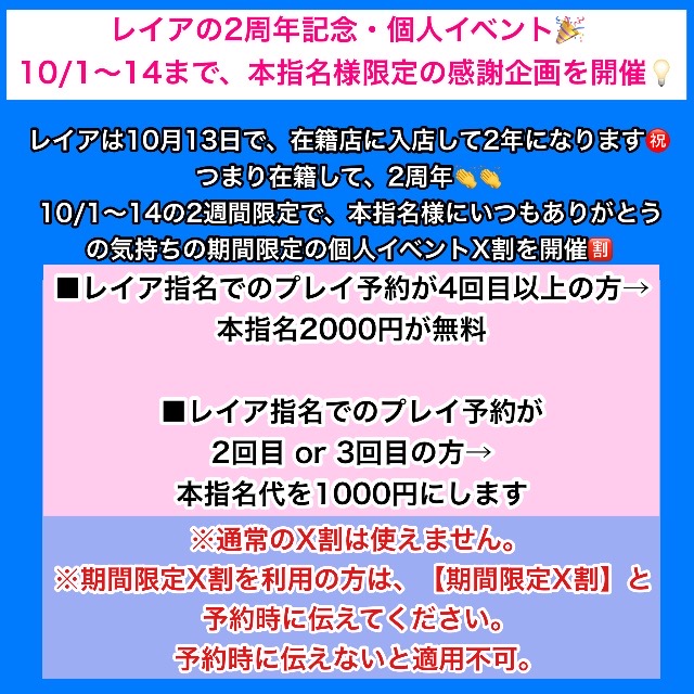 ■レイア指名でのプレイ予約が2回目 or 3回目の方→本指名代を1000円にします